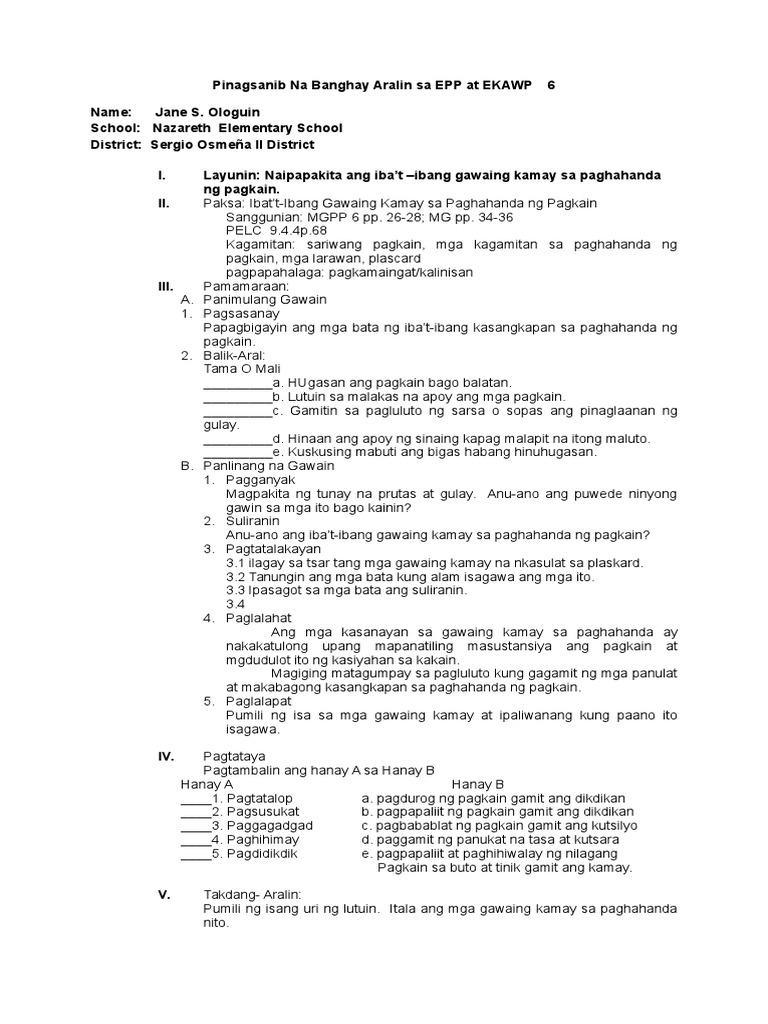 Lesson Plan Epp 6 Mga Gawaing Kamay Sa Paghahanda Ng Pagkain