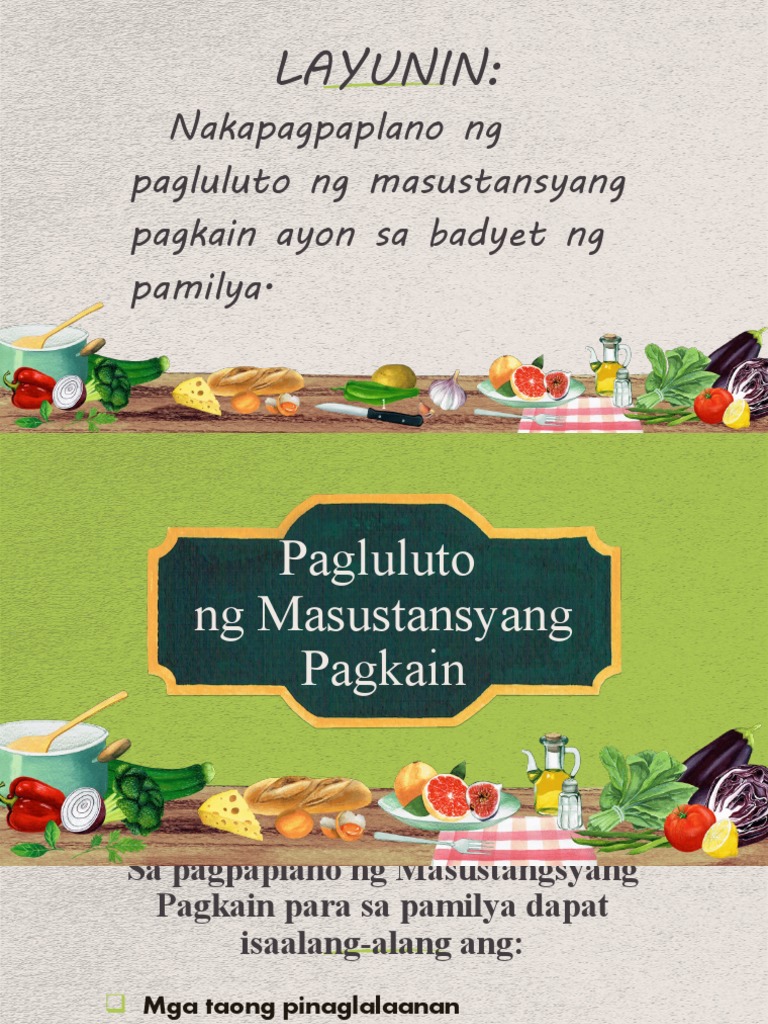 Nakapagpaplano ng pagluluto ng masustansyang pagkain ayon sa badget ng pamilya natutukoy ang mga salik sa pagpaplano ng pagkain ng pamilya at nakagagawa ng menu para sa isang araw batay sa food pyramid. ALAMIN ang mga pinakamasustansyang pagkain para sa ating kalusugan. Alamin ang mga pinakamasustansyang pagkain para sa ating kalusugan.